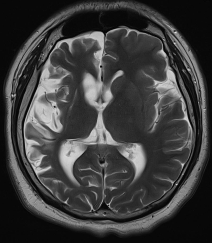 A plain CT brain revealed asymmetrical cerebral atrophy worse over the right hemisphere, predominantly affecting the frontal / temporal / insular regions, with proportional enlarged bilateral lateral and third ventricles. There were no gyral calcifications.