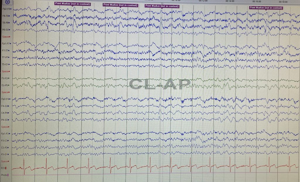 An EEG showed asymmetrical background with right hemispheric slowing. There were sharp-slow and spike-slow waves over the right posterior temporal regions with concomitant left finger polyminimyoclonus.